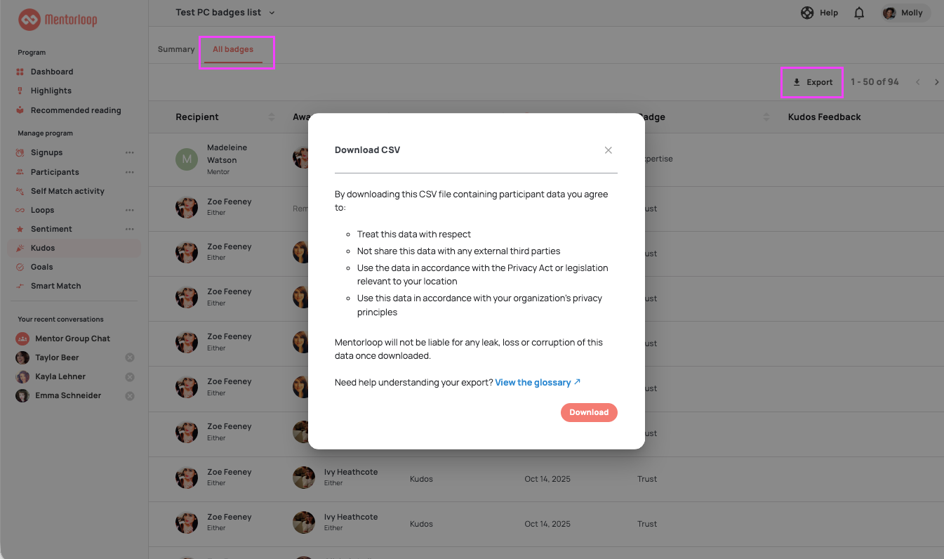 Program Coordinators and Program Admins can also export a CSV of all badges awarded, for their own reporting.
