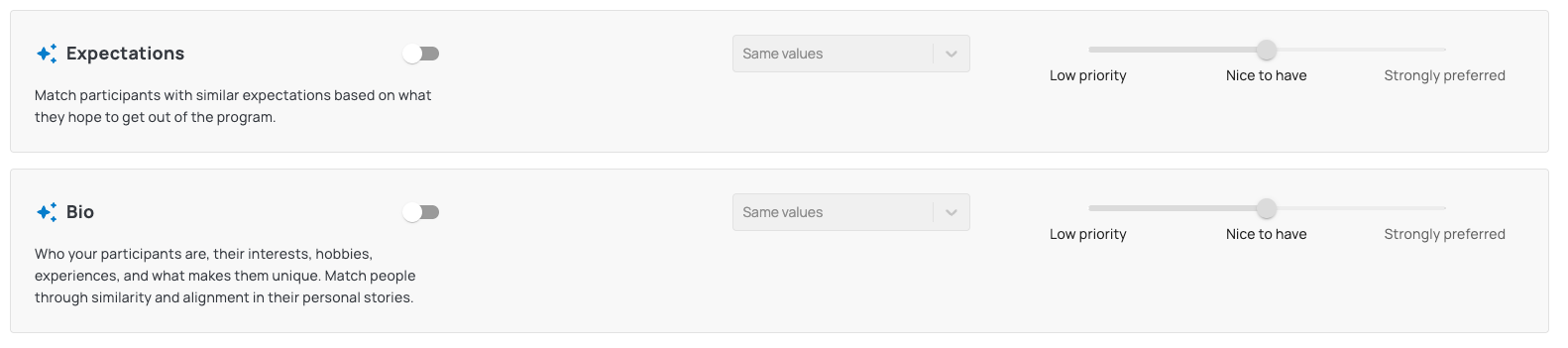 If your signup form includes additional free-text fields beyond Bio and Expectations that you would like to include in matching, reach out to your Customer Success Manager. Custom free-text fields can be enabled as AI-matched rules on your Smart Match page.