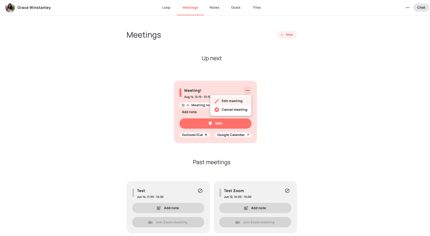 If you need to log a meeting that has already occurred, you can log that meeting within your 1:1 loop or meetings tab.