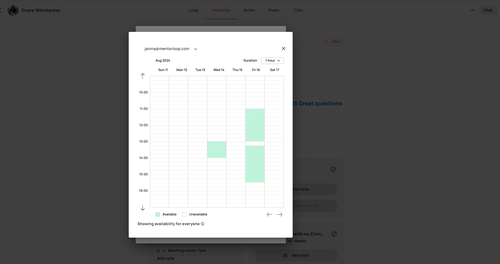 If you both have calendar integration linked to Mentorloop, you will be able to see the availability of your mentor/mentee highlighted in green. When a time is selected, you will be prompted to confirm.
