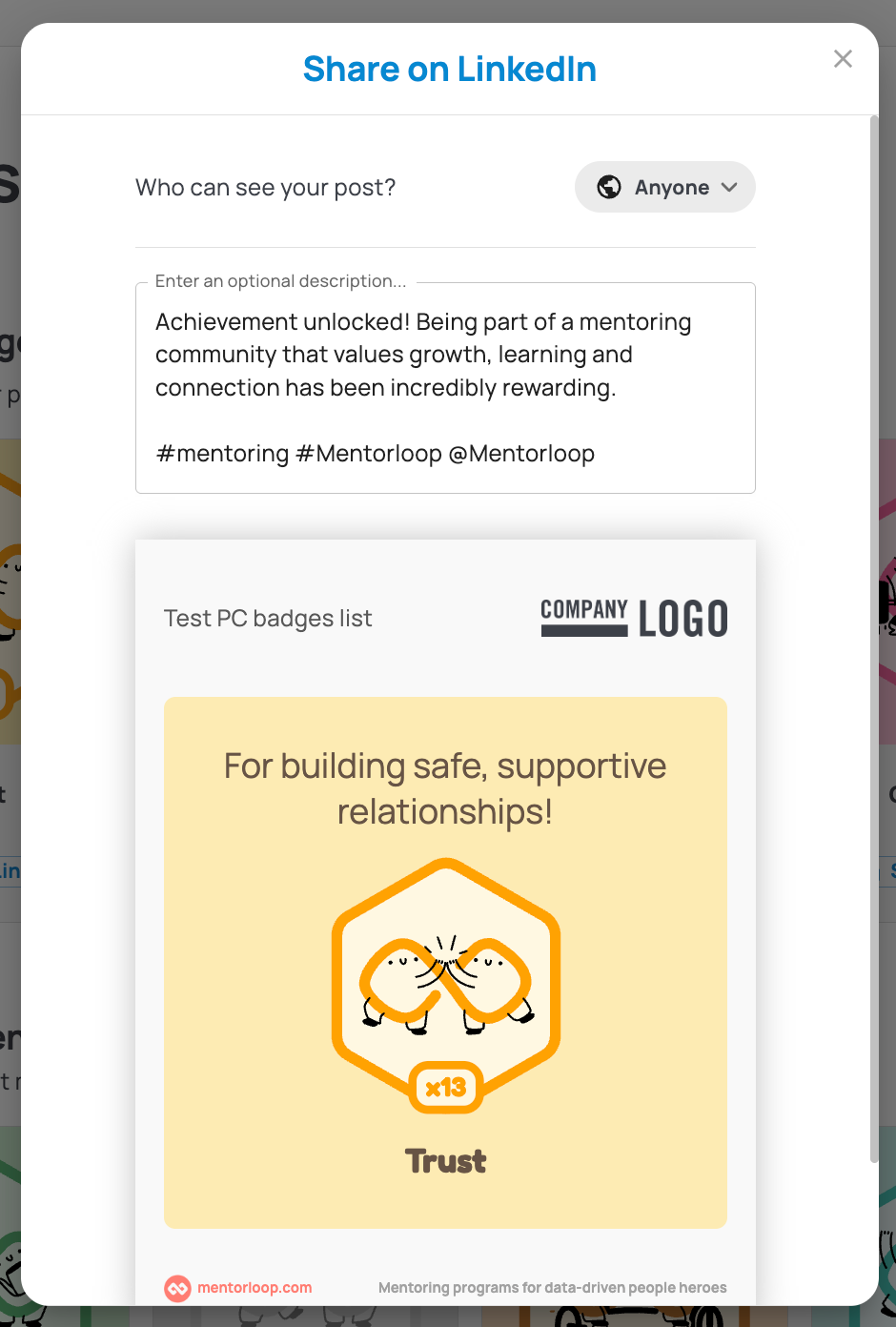 Participants in your program can share their Kudos and Achievement badges to LinkedIn directly from their Kudos page in Mentorloop.